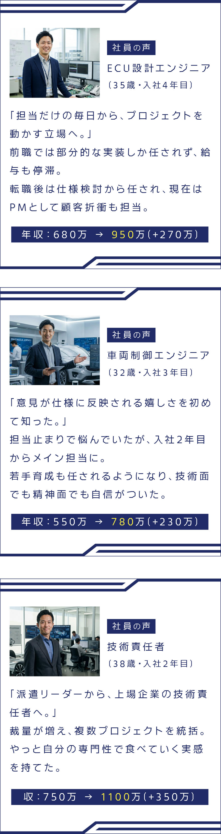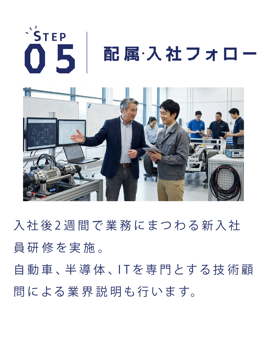 自動車の制御設計、ECU仕様設計、ソフトウェア開発などでおおよそ3年以上の実務経験があれば、これまでの経験を踏まえたポジションをご提案します。