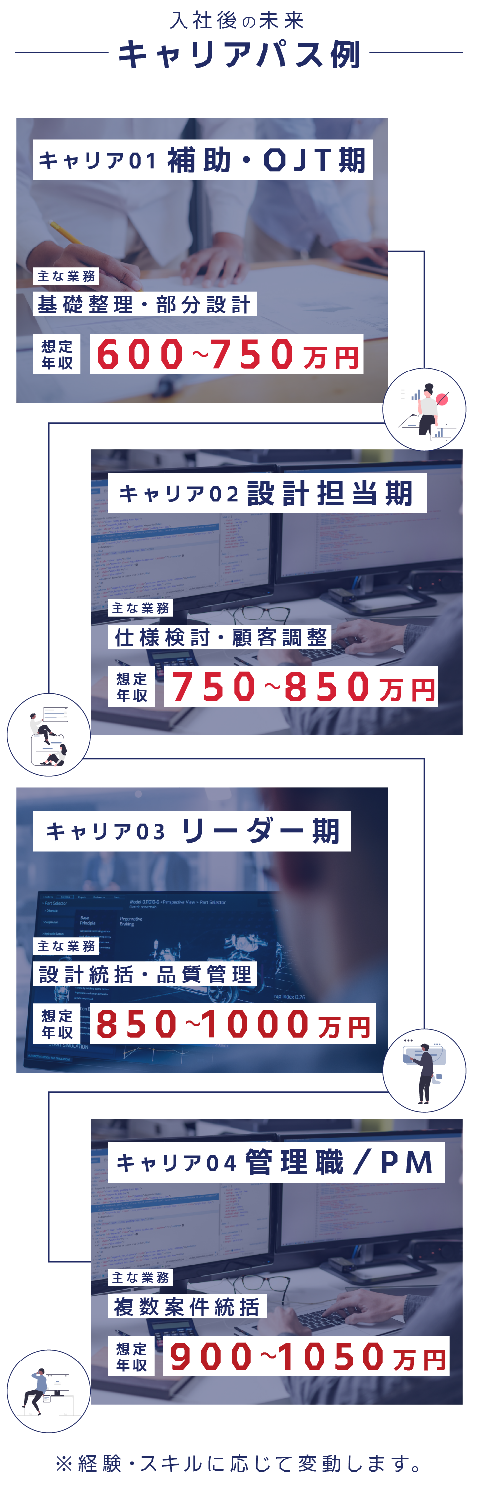 設計者として専門性を高める道はもちろん、プロジェクトリーダー、プロジェクトマネージャー、技術責任者といったポジションも目指せます。