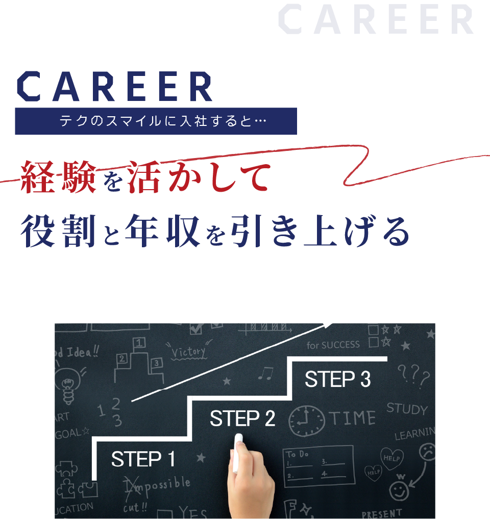 テクノスマイルでは、あなたの経験値やスキルに合わせて最適なステップで成長できる仕組みを整えています。
