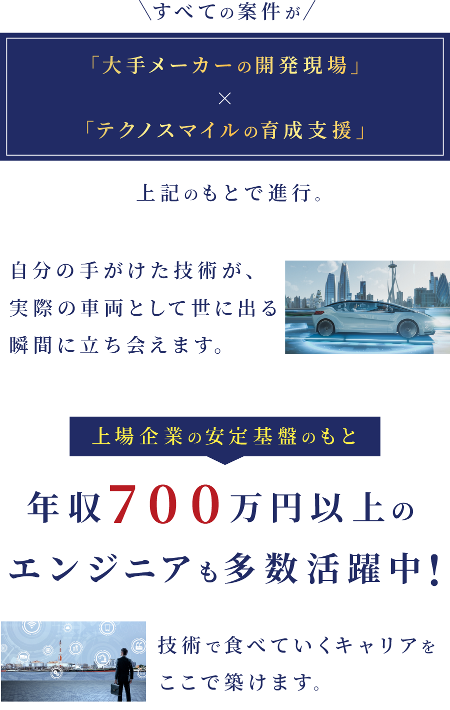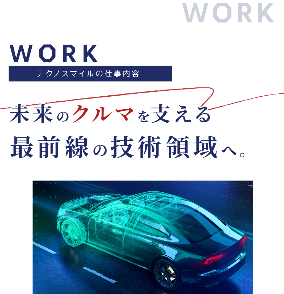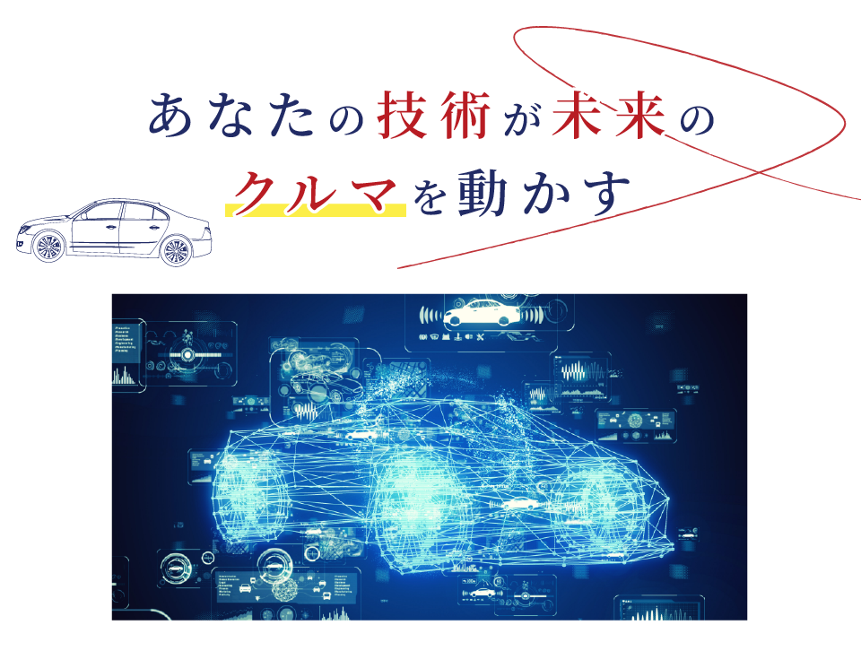 テクノスマイルでは、大手自動車メーカー直請けの仕事を中心に、“次世代技術”を支える開発に関わることができます。
