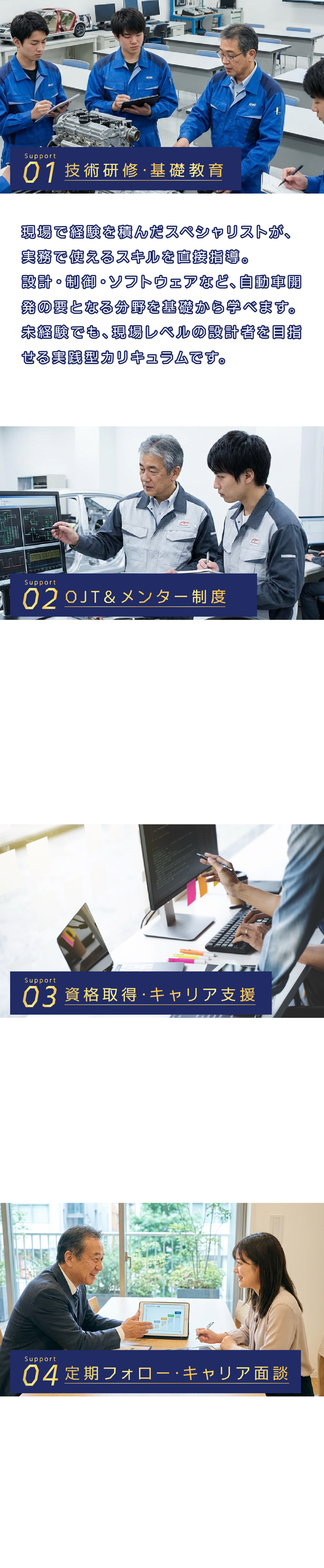 新入社員研修では、CATIA基礎・機械設計・ECU制御の基礎などを、2〜3週間の導入研修+現場OJTサポートでしっかり習得。 経験に応じて段階的にステップアップできる仕組みです。