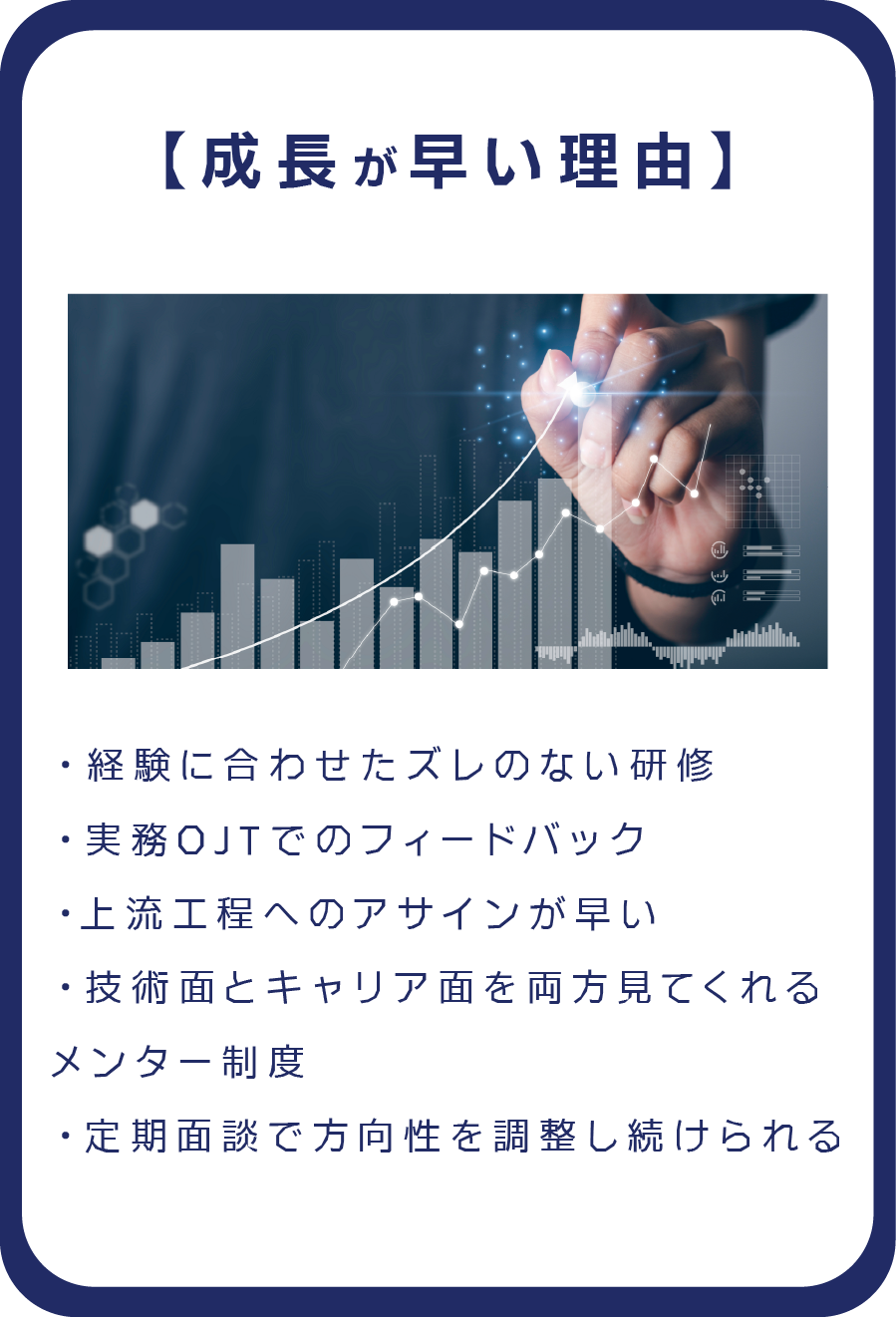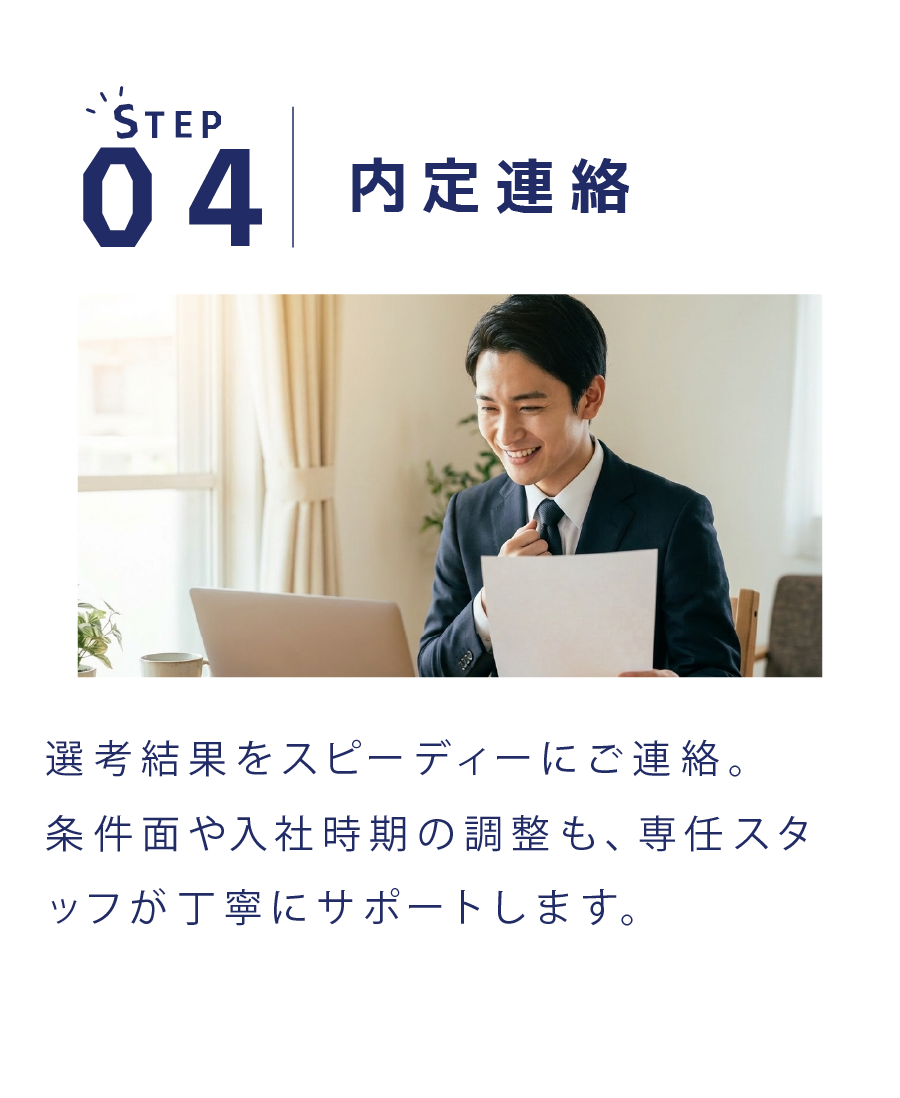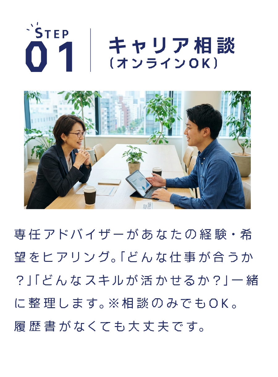 定期的な面談の中で、あなたが目指したい姿に合わせてキャリアを設計していきます。