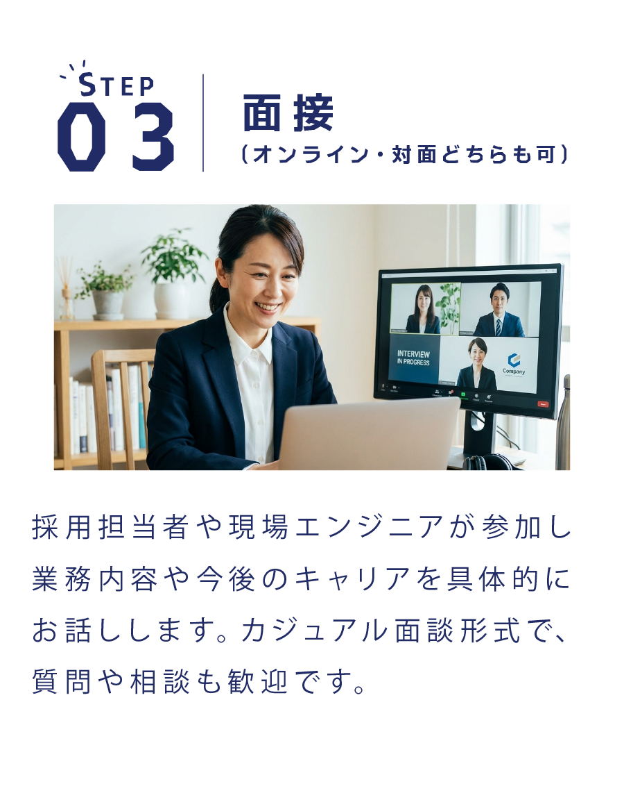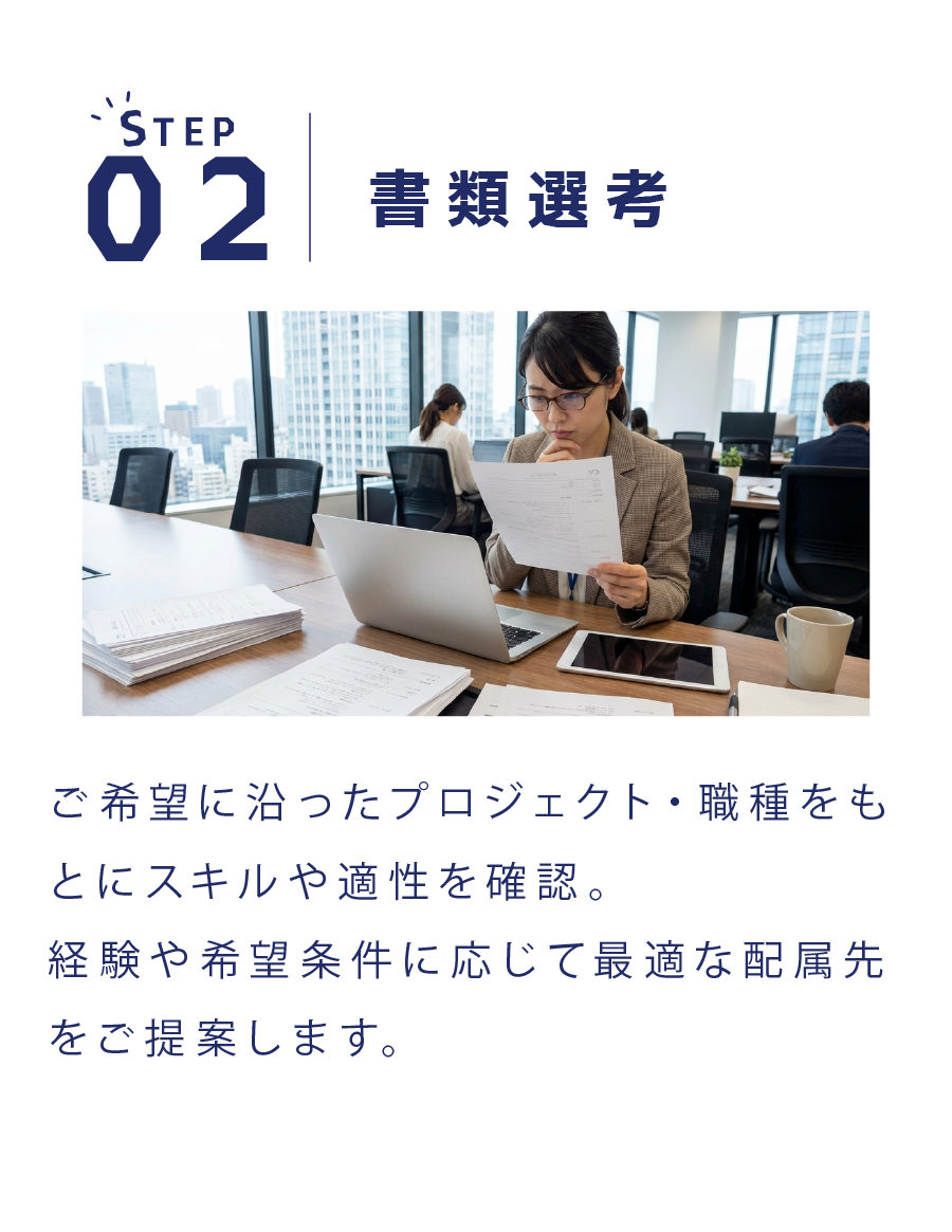 ご希望のエリアやプロジェクト内容を踏まえて、通勤や生活面も含めて相談しながら決めていきます。