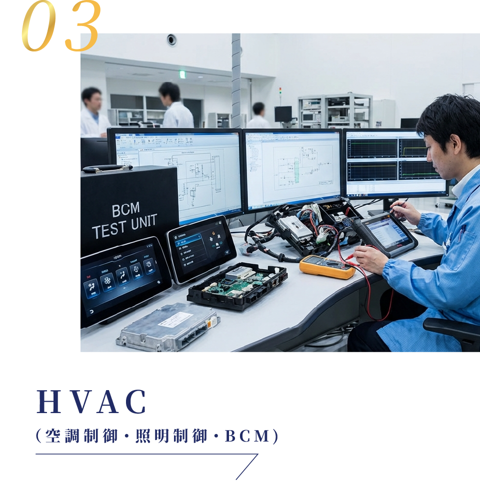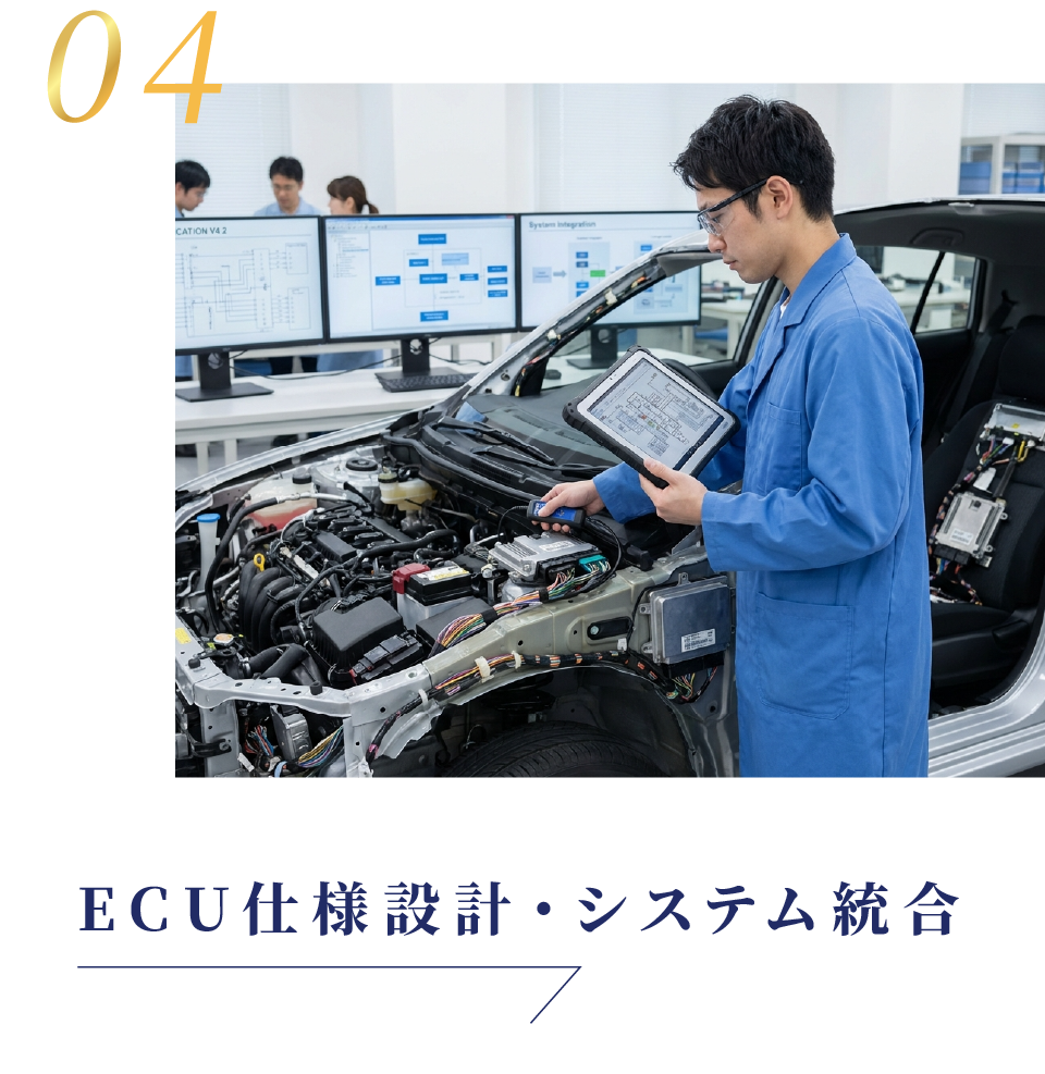 複数のECUをつなぎ合わせる通信設計、機能安全やセキュリティを踏まえた全体アーキテクチャ設計など、 車両全体を見渡した上流工程を担当します。